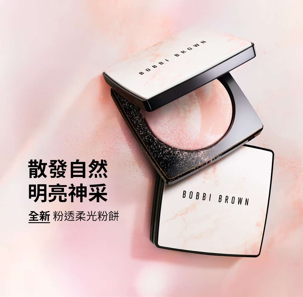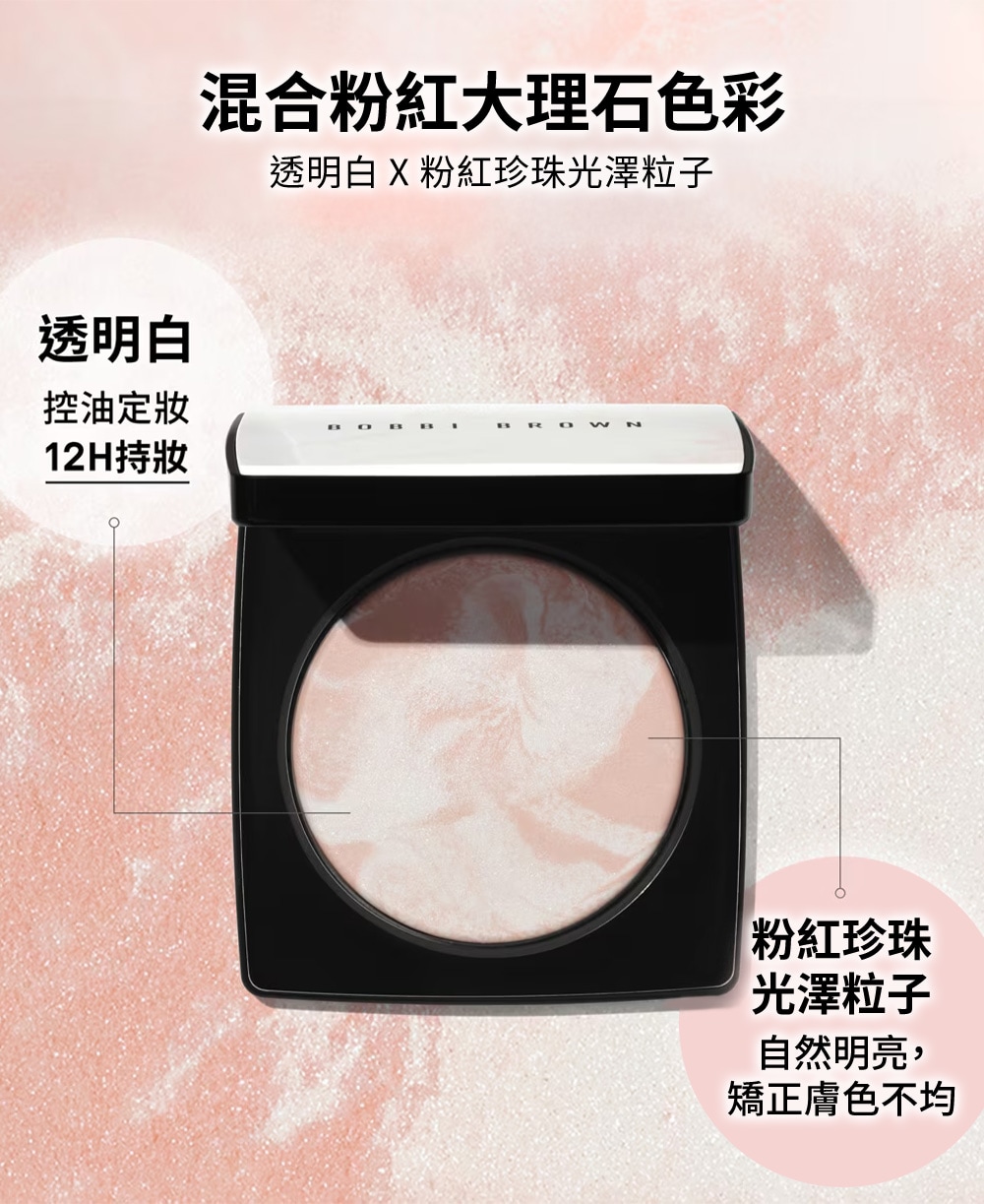 粉餅混合粉紅珍珠光澤粒子,在光線折射下,散發自然明亮、柔焦的妝效。