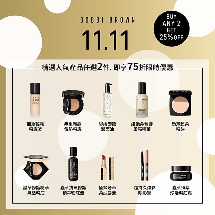 * Bobbi Brown保留因未經授權、竄改或不符合使用條件的情況而取消訂單的權利,並有權在系統錯誤或其他不可預見情況下修改或取消此優惠。