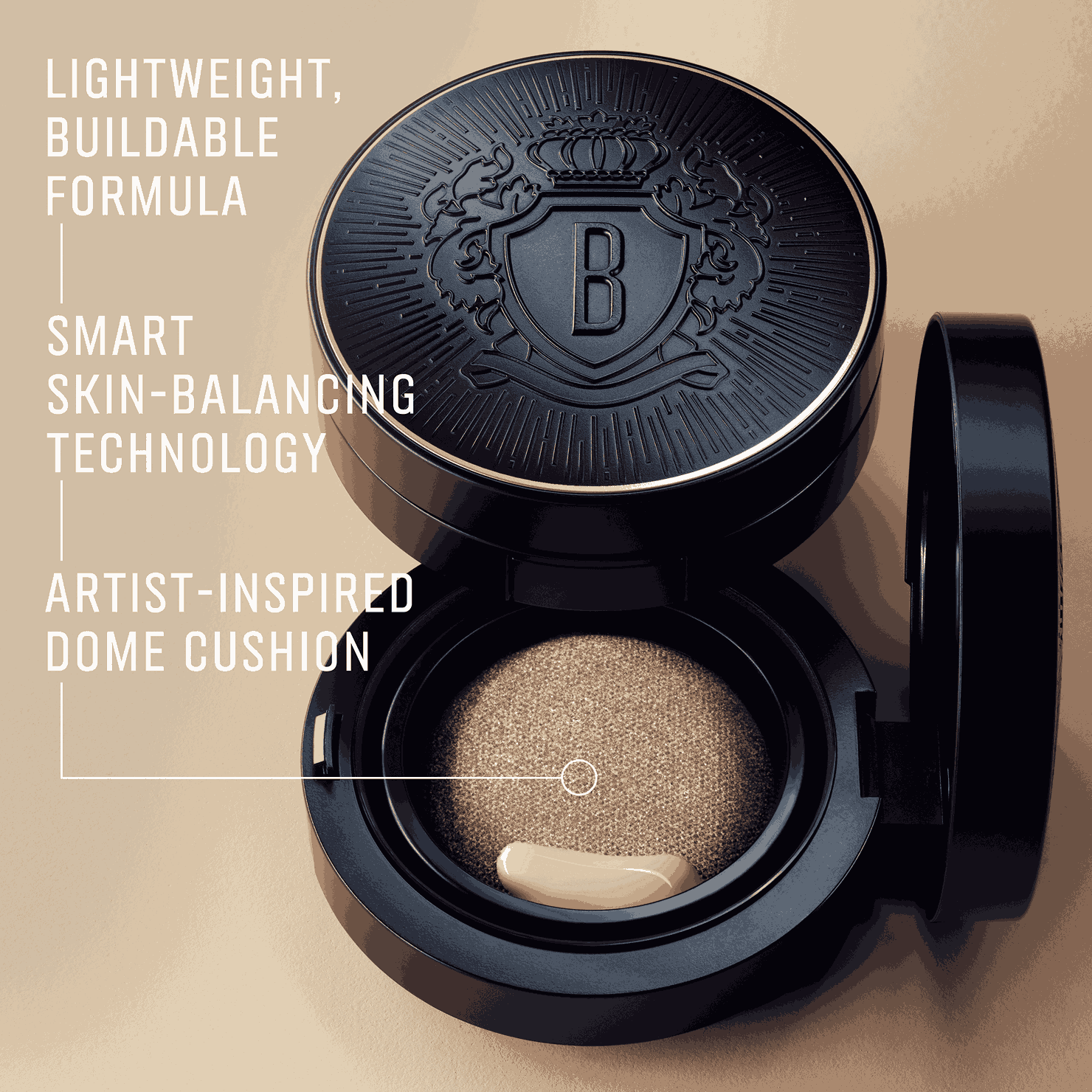 創新氣墊設計方便隨時補妝,採用高效平衡科技提供 12 小時保濕及控油效果。防水、防汗配方帶來自然柔霧、貼膚妝效,不結塊、不起皺、不暗沉。拱型粉撲設計有助均勻取粉,打造輕盈無重的完美底妝。