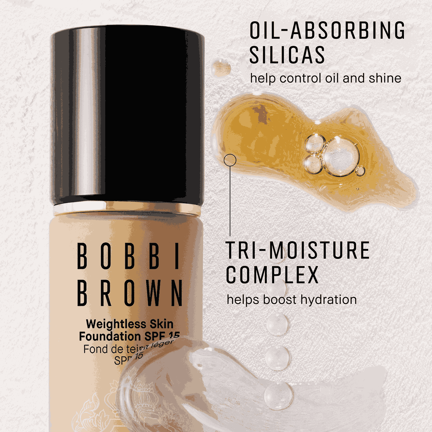 搭載獨家高效平衡科技,粉底液能全天候控油並維持保濕,使肌膚一整天保持舒適平衡並呈現自然霧面妝效。油脂吸附粉末可有效減少油光而不令肌膚乾燥,而三重保濕複合物—透明質酸、甘油與蜂蜜萃取—為乾燥區域深層補水。配方具備防水、防汗、防潮、抗轉移、抗脫妝、不結塊及隱形毛孔效果,妝感細緻服貼且持久。